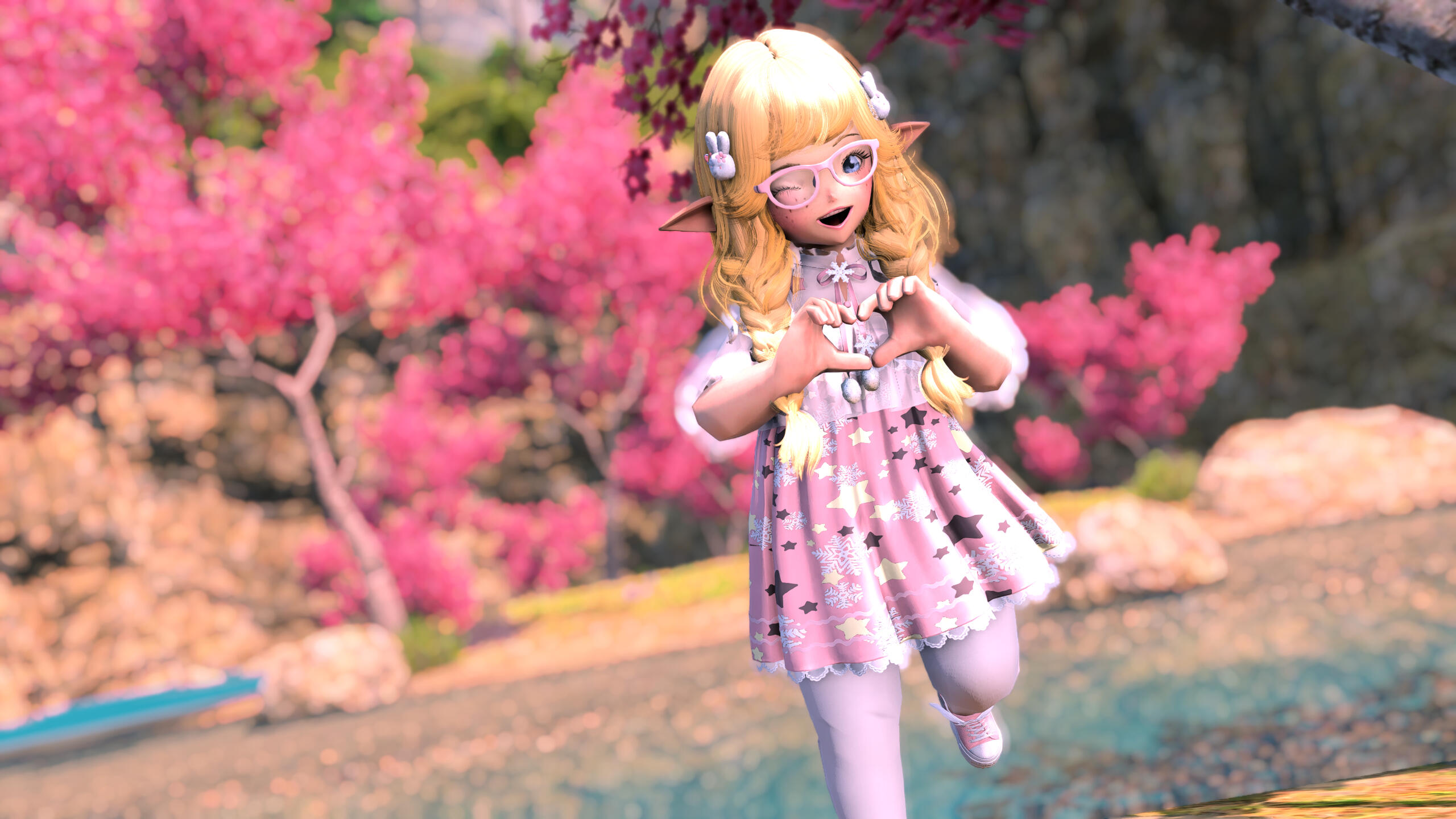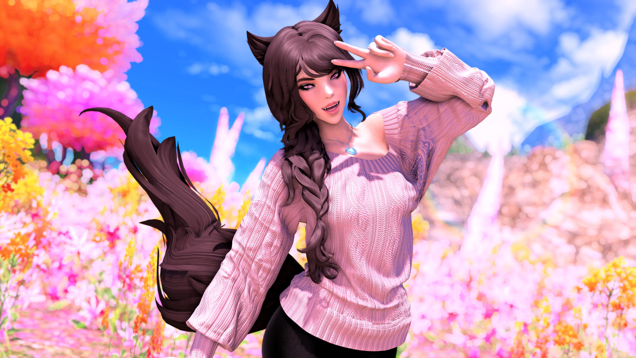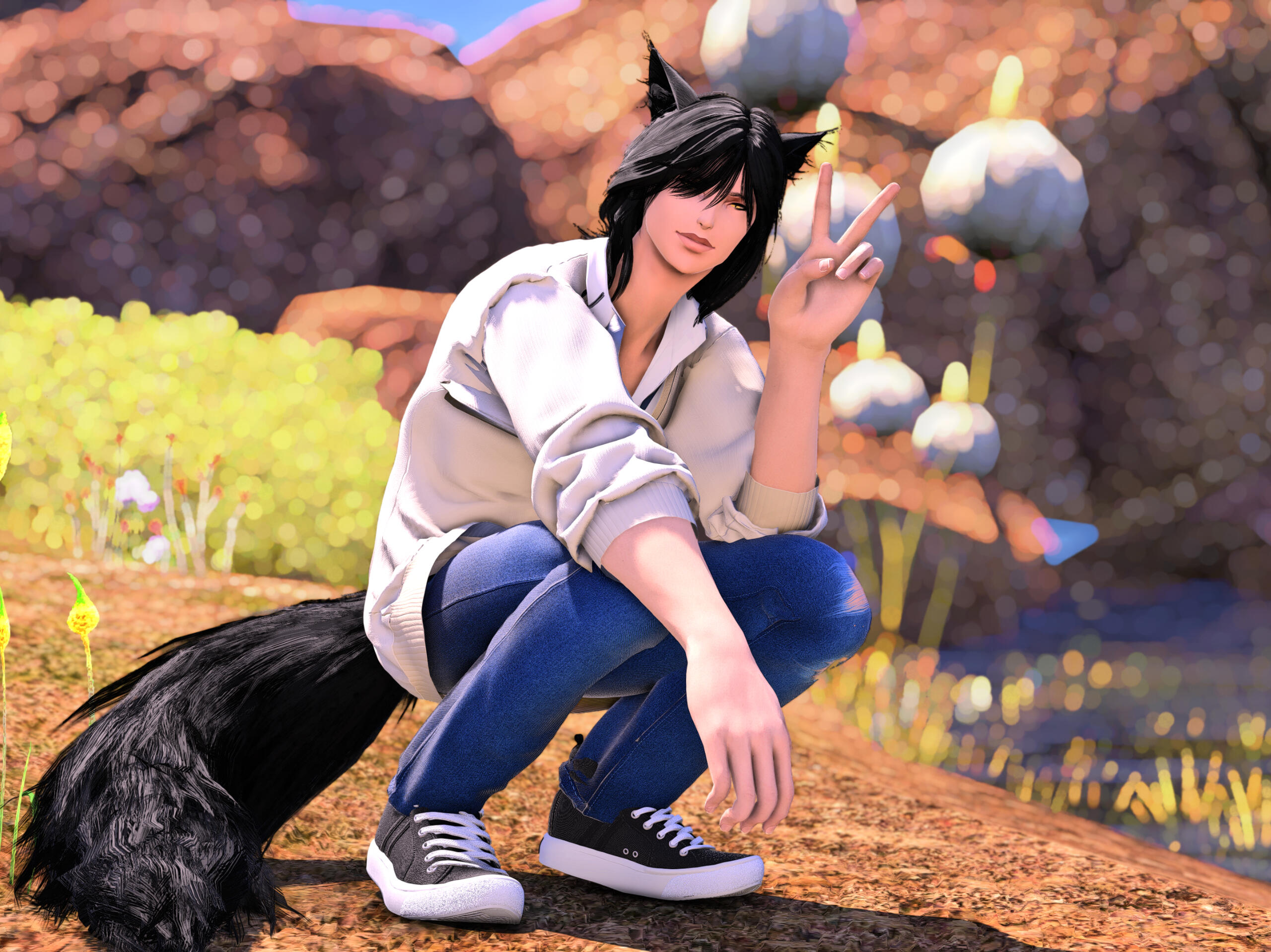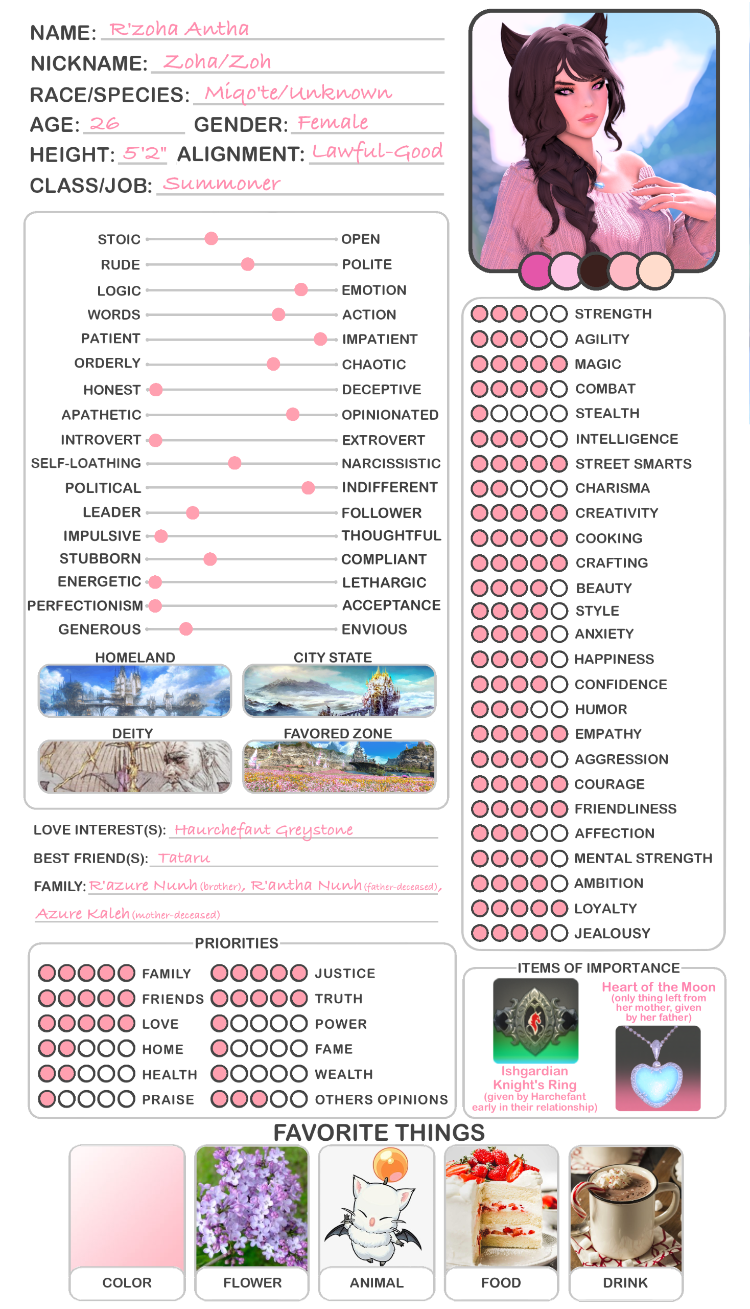 R’zoha is very positive, friendly and upbeat with everyone she knows or meets. She’s fairly introverted, though, so doesn’t handle lots of people as comfortably as other folks might. And while being very friendly, she’s still very quiet/shy around new people. Despite that, however, she’s very open and boisterous around those she knows well and considers a friend, so often times she is mistaken for being more extroverted than she actually is. Regardless, she does always try to help others find happiness as that brings her the most joy in her own life. Rarely focusing on her own accomplishments, she delights in hearing about the achievements of others around her.It doesn’t show often, but she is also incredibly sassy around anyone she’s most comfortable with, her younger brother, or when taunting her enemies. It’s only occasionally slipped out during meetings where she’s trying to bite her tongue. She did grow up in Limsa Lominsa, so she swears a lot and is also extremely competitive, both mostly due to being surrounded by the pirate culture. While she tries to hide or bottle her emotions, her ears and tail are a dead giveaway for how she’s feeling as they will always move according to her current mood. She will also head bump the people she loves most, as a sign of affection. When it comes to things she’s passionate about, she can sometimes be moody and emotional. She blushes easily and, while it’s pretty cute, this can sometimes frustrate her if it’s pointed out.Her default mode, when she’s with friends, is very excitable, chatty, a little clumsy, and extremely distractible. She is fairly intelligent but if something else is interesting then it has all of her attention, so she can sometimes miss details of a conversation or situation because of that. This especially happens when she’s around moogles or moogle related things. They’re her most favorite for their squishy, plump adorableness and she keeps a secret apartment in Ul’dah, to house all of her moogle related memorabilia (it’s not an addiction unless it becomes a problem, right??). The only people in Eorzea who currently know about this are her younger brother, who loves to tease her over it, and her husband Haurchefant, who’s very supportive and even encourages it, because he thinks it’s really cute when she gets excited about her interests.Her favorite food is strawberry cake and her favorite color is pastel pink (most of her wardrobe is this color). While she prefers to remain comfortable and mobile in her gear, there is a part of her that enjoys dressing up and looking really pretty for events, even if she ends up being a wallflower for most of them. Her favorite pastimes are drawing, baking, and singing (to herself, not around others) and she’s very skilled in all three. Even though she is introverted, she can definitely appreciate going out with friends from time to time, as much as cuddling up with some cocoa and a good book. She loves music and is always excited to get new recommendations from others and, despite not being well versed in it, she also loves dancing a lot as well.While considered attractive by many others, her physical appearance is much shorter than most Miqo’te her age and her chest isn’t as “well-endowed” as some of her peers. Despite her thinking these are issues, they’re never noticed by anyone else because it’s her pretty smile, bright eyes, joyful laughter, and fun personality that wins most folks over. She’s 26yrs old, 5’2”, and has dark brown, long wavy hair, that’s kept in a loose braid, and a matching long silky tail. Her left eye is a dark pink, while her right eye is a very pale pink. Both eyes used be dark pink, but the events at the Battle of Carteneau left her right eye the way it is now. While it was initially thought that this was due to aether overexposure from the mysterious flash of light on the battlefield, it isn’t until she learns of her ancient/Azem-self, Euphrosyne, that she finds out they had pale pink eyes. The unknown flash of light at Carteneau, coupled with receiving the Blessing of Light at the same time, was merely the trigger for this effect. All of her other shards also have a pale pink, right eye.She is not without fault though. She has trouble relinquishing control in situations or missions, or delegating tasks to others. Her Type-A personality shows a lot here, because she’ll often default to “well I can just do it myself”. She has trouble asking for help, and should she lose control of whatever situation she’s in it causes her a lot of stress, and she’ll get frazzled easily. She’s very much a perfectionist and will frequently criticize herself for not doing or saying things as “perfectly” as her mind made her think it should have been. She’s very prideful of her work and always wants to make sure she does a good job. This occasionally does come with an ego, as she might get a bit smug whenever she accomplishes a particularly difficult task.Unfortunately, she does also carry a heavy weight in the form of survivor’s guilt. Her parents were murdered when she was very young and, while they forced her to hide with her younger brother, she sadly saw the whole event unfold. This is compounded when she becomes the WOL, as there are more occasions where she loses others despite her best efforts. She’s only able to begin working through this after seeing her parents again in the Altiascope. Because of their past though, she is extremely protective of her little brother, as he is with her too. They ended up both receiving Hydaelyn’s Blessing and therefore share most of the WOL’s duties, so they see each other often in their work and are very close and supportive of each other.Despite her struggles, she still manages to remain resilient in difficult situations, or in the face of failure. Her optimism and confidence are often anchors for others around her, who may lose their willpower over the c