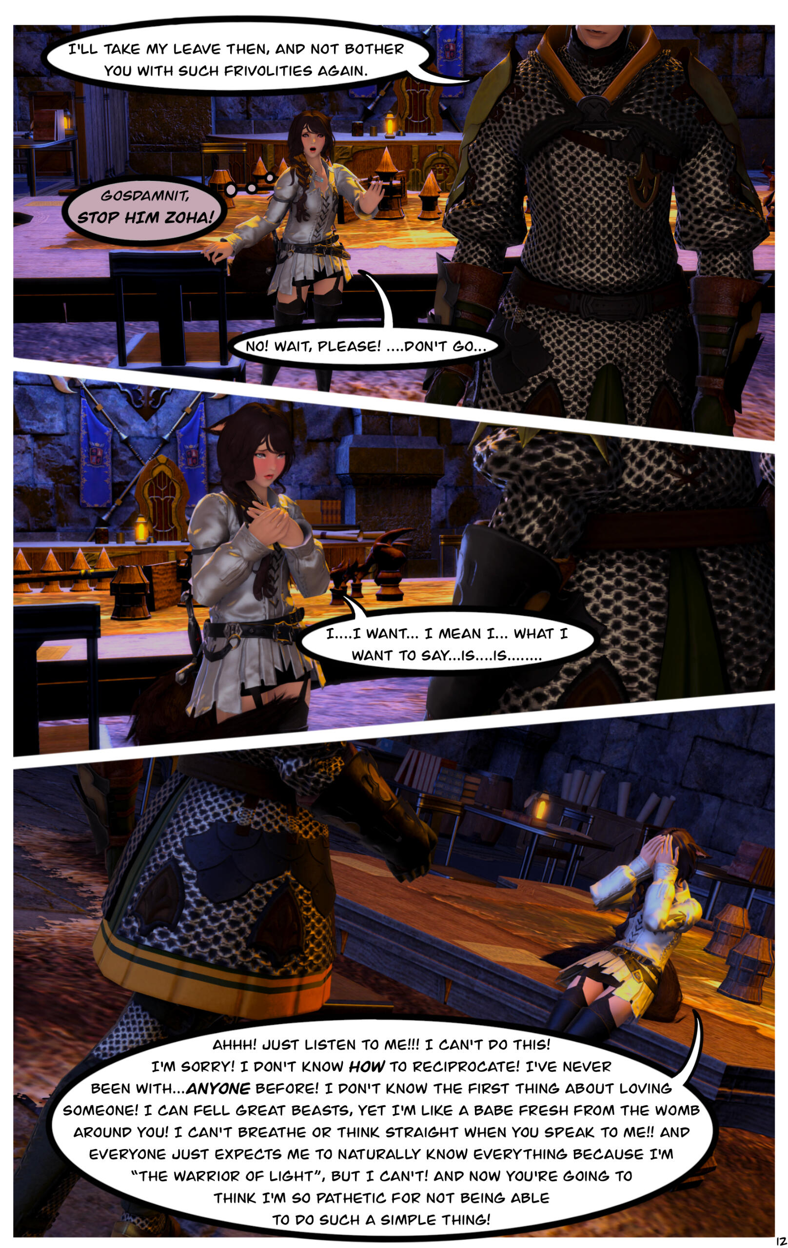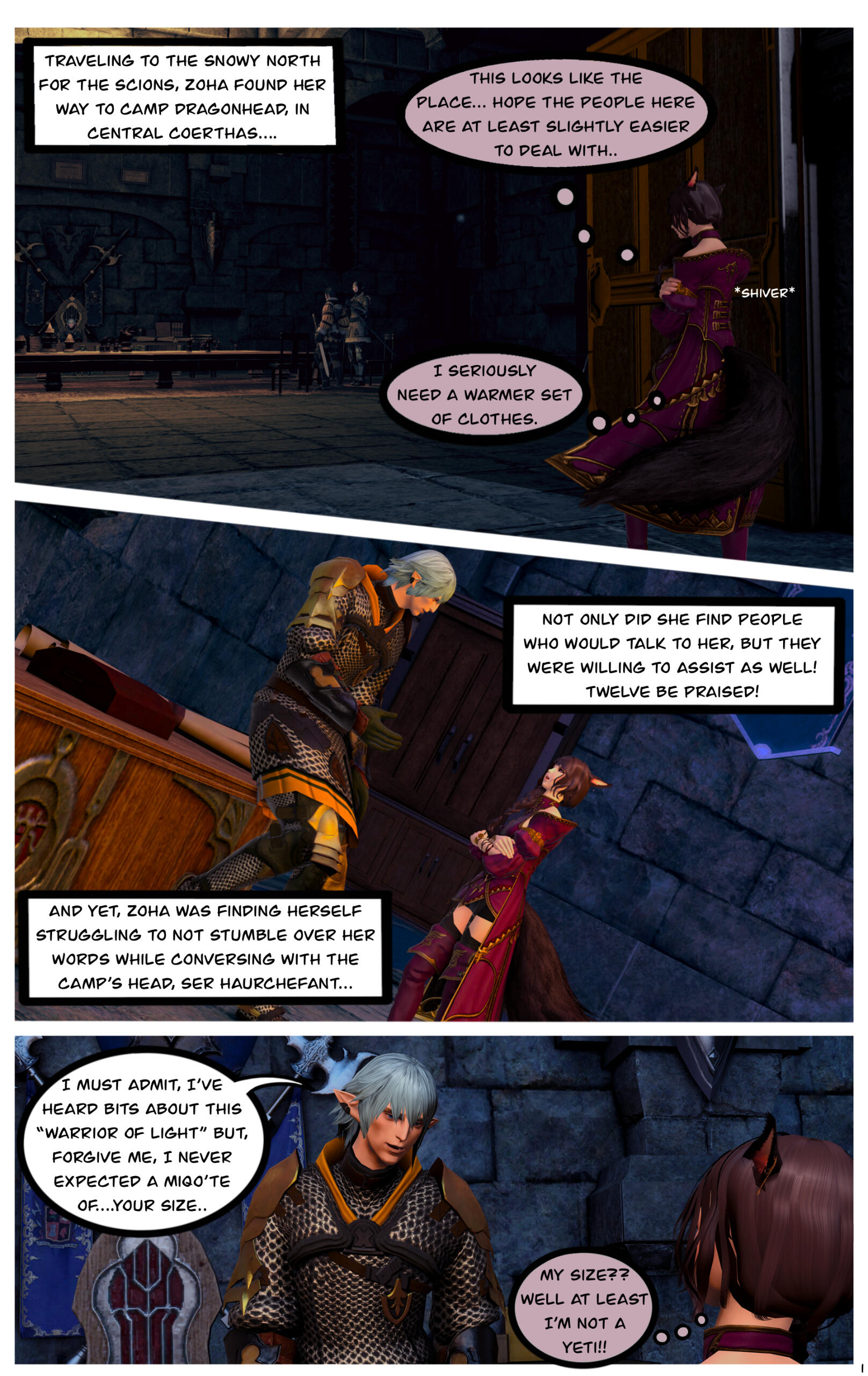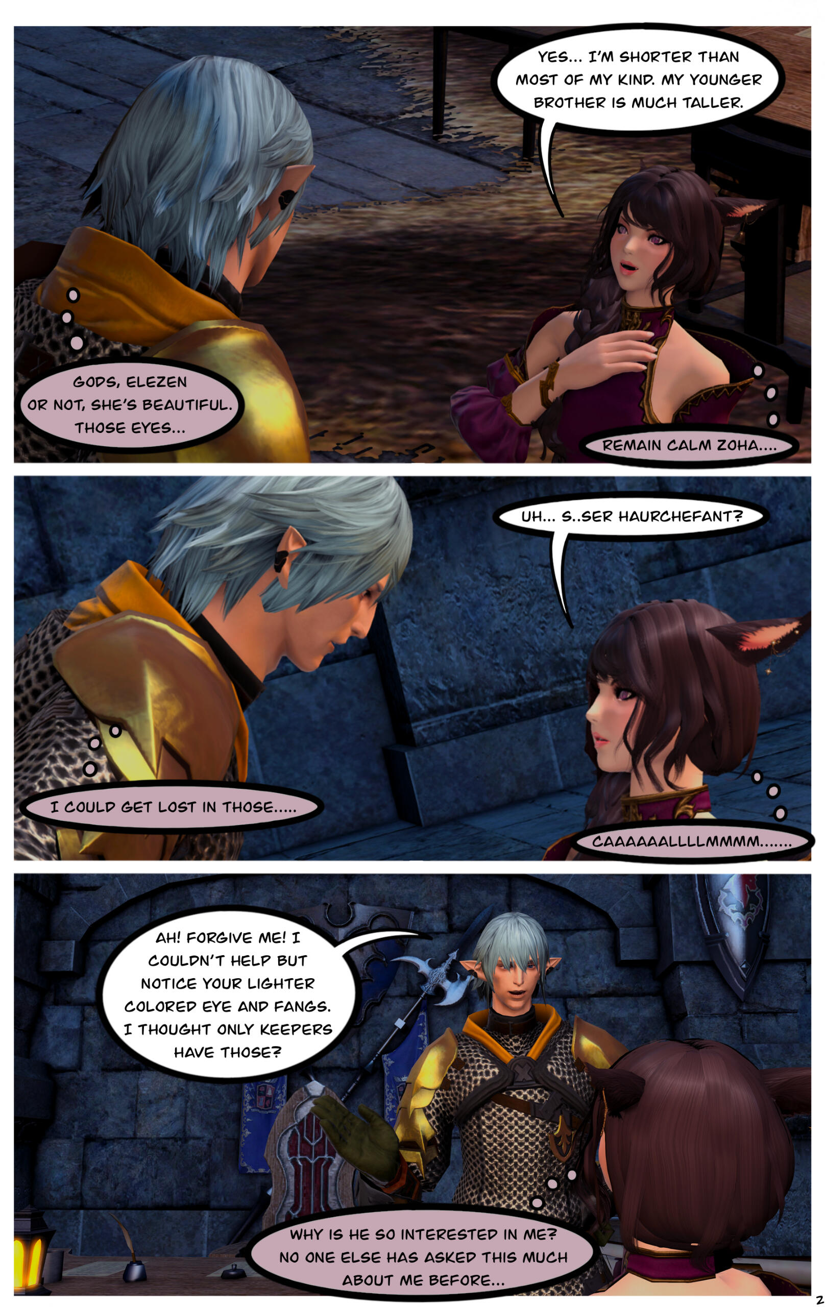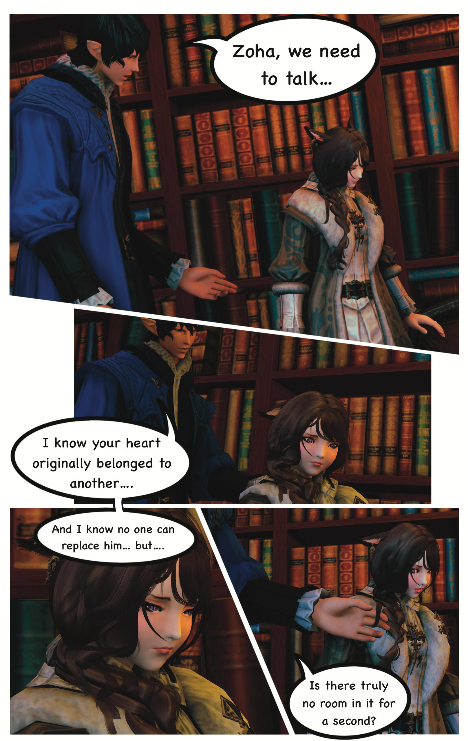 When they awoke, they could not recall how they got where they were or the events that had transpired prior. Zoha made her way back to Ul'dah and registered with the Adventurer's Guild in the city. R'azure decided to return to Limsa Lominsa, to register with their Adventurer's Guild. Writing to each other often, they began to do well for themselves, becoming well known with the locals in their Guilds.After a time, they both began to notice a change in themselves and their magicks. Not only were they much stronger than before, but they were also far more sensitive to those around them. On occasion they would feel a powerful force causing them to witness other events outside of their own lives, and sometimes could even feel or see what the other was feeling or doing. Not sure what this was, they shared it only between themselves.This effort of concealment was missed by most, save for the eyes of a neutral group known as the Scions of the Seventh Dawn. They had been seeking “exceptional” adventurers, like the siblings and others, to join their cause. With nothing tying them down, the two agreed.Her duties with the Scions kept her busy, but it did also provide quite the adventures and travels. The work was also fulfilling as Zoha helped each person or group she came across. R'azure, too, supported the work and message the Scions preached. Using his talents in healing and strategy, he worked closely with some of the other members in the group who were similar, while Zoha spent more time out in the field.Along the way they were also requested to join one of the City State's Grand Companies. While it did add more to her busy plate, it was a request Zoha couldn't afford to refuse. She opted to join The Immortal Flames of Ul'dah under General Raubahn Aldynn. The members were a hardy bunch and Zoha enjoyed their company as well. R'azure joined the Maelstrom of Limsa Lominsa, under Admiral Merlwyb Bloefhiswyn.While things with the Scions did get more political as time went on (God, she hated politics), Zoha was happy with the work and the people along side her. She was able to travel all over the realm, helping a great many of people, taking down powerful foes, and returning to tell her tales to the next eager minstrel. Even her brother was able to join her on several missions. The Scions began to grow, taking on more individuals, and beginning to work towards greater goals for all.During one particular job, she was sent to the snowy lands of Coerthas, to hunt down a missing airship. She had little experience with the people in this area and ran into a lot of resistance trying to request any kind of aid in her search. Upon reaching a location known as Camp Dragonhead, however, she found an Elezen known as Ser Haurchefant Greystone who welcomed her and offered assistance. Though only a couple years older, he was much taller than her and very handsome, with silver-blue hair and deep blue eyes. For the first time in her life Zoha found herself at a complete loss for words around him, as her father once did with her mother. While extremely kind-hearted, Haurchefant was also incredibly forward, and quite unapologetic about it, which only caused Zoha to fumble over her words even more. This mildly frustrated her, as she had zero experience with this sort of thing. In her 26 years, she had been so busy studying and working, she never once considered a relationship with anyone and thus was sorely inexperienced at how to respond to Haurchefant's advances.However, this back and forth didn't last too long, as one evening, while going over the plan for the following day, Haurchefant made his move. At the risk of sounding uninterested, Zoha was forced to admit her shortcomings to him, which unsurprisingly did not dissuade him in the slightest. He knew he loved her, and he was willing to go to any lengths to make her happy.Over the course of her time in Coerthas, she spent her days gaining the local's trust to assist in the lost airship search and trained in the various ways of Ishgardian combat with the Camp Dragonhead knights. Her every night was spent with Haurchefant, as he trained her in the various ways of love. At the time, it would have been difficult to be open about their relationship, especially since Camp Dragonhead was providing assistance to the airship search and vouching for the Scions, so they decided to keep quiet about it until a better time allowed. Not only that, inter-racial relationships were still frowned upon in many areas of Eorzea, especially ones as traditional as Ishgard's nations. Twelve be damned, though, Zoha couldn't care much less about anything but him.After several weeks, the airship had been found and she was called back to the Scions. Though disheartened to leave, she agreed to visit whenever able and both agreed to write when she could not visit. Before setting off, Haurchefant gifted her an Ishgardian Knight's ring so that she could always have a part of him with her. It was a beautiful dark metal with the crest of his family, House Fortemps, on it. She never took it off. With a kiss and a wave, she was on her way back.Jobs with the Scions began to increase in frequency, though, quite frankly, Zoha didn't really think too hard on them as she completed each task. Her thoughts were elsewhere, in the snowy north. She had excitedly told her brother about her time there, though she did leave out some particular details. R'azure was happy for her, but also a bit concerned for who the hell this Elezen was, sweeping his sister off her feet like that. They didn't have too much time to speak more on the matter, as the Scions decided to move their main base of operations to a more neutral zone. The new HQ was going to be on the south end of Coerthas, in Mor Dhona, which meant she had the ability to see Haurchefant even more. So while others struggled with the decision to move, she happily pitched in with the efforts.Over the next week or so, Zoha continued her duties and seeing t