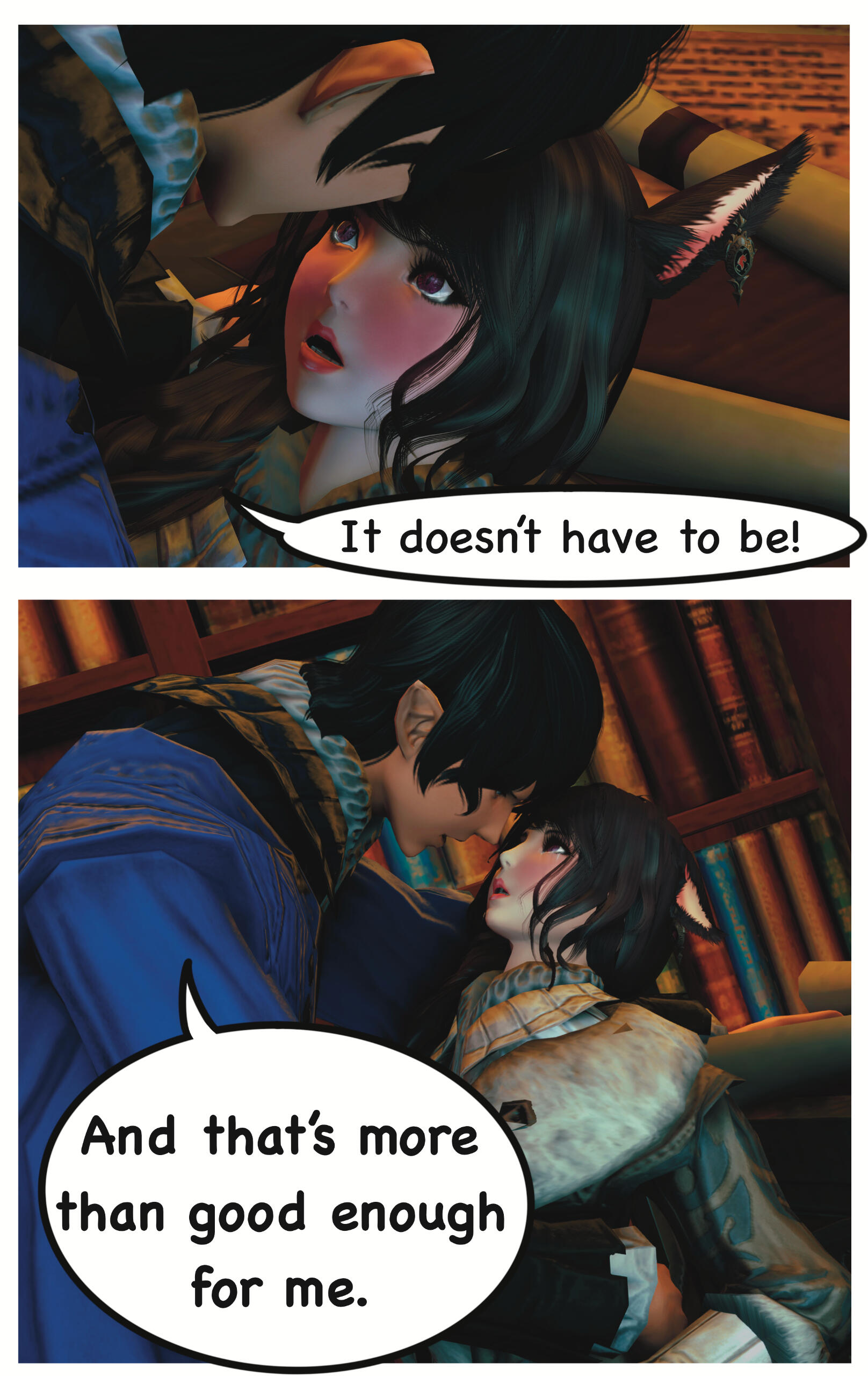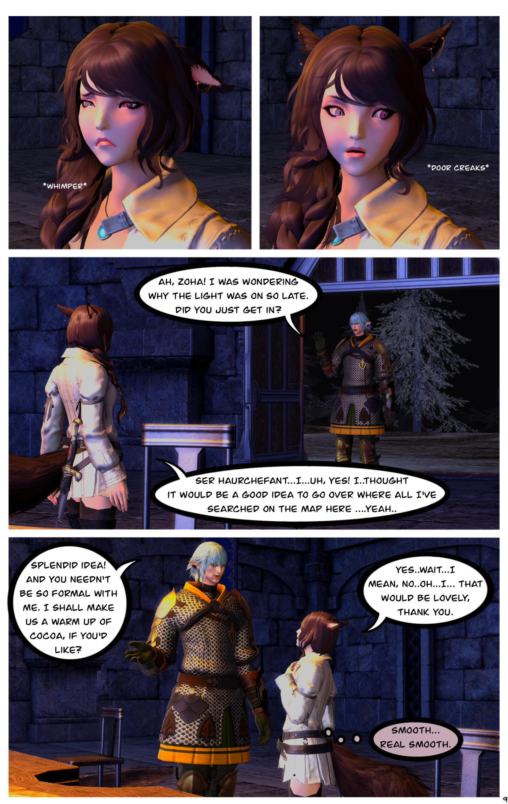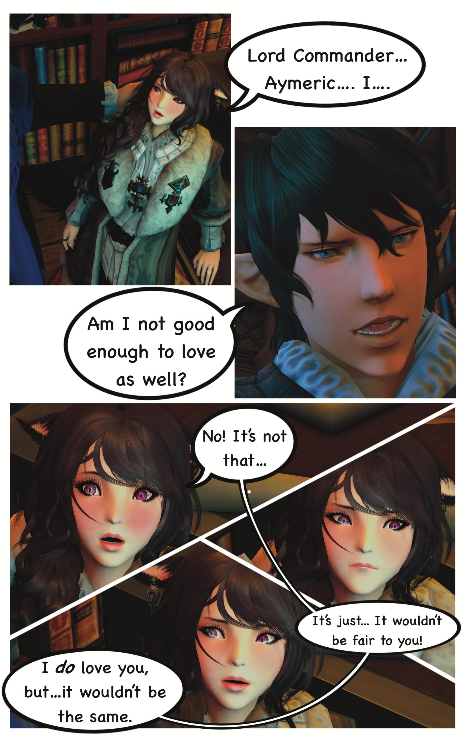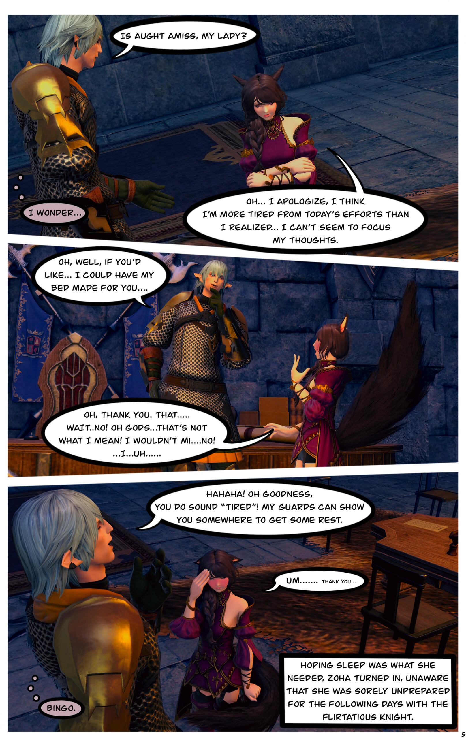 When they awoke, they could not recall how they got where they were or the events that had transpired prior. Zoha made her way back to Ul'dah and registered with the Adventurer's Guild in the city. R'azure decided to return to Limsa Lominsa, to register with their Adventurer's Guild. Writing to each other often, they began to do well for themselves, becoming well known with the locals in their Guilds.After a time, they both began to notice a change in themselves and their magicks. Not only were they much stronger than before, but they were also far more sensitive to those around them. On occasion they would feel a powerful force causing them to witness other events outside of their own lives, and sometimes could even feel or see what the other was feeling or doing. Not sure what this was, they shared it only between themselves.This effort of concealment was missed by most, save for the eyes of a neutral group known as the Scions of the Seventh Dawn. They had been seeking “exceptional” adventurers, like the siblings and others, to join their cause. With nothing tying them down, the two agreed.Her duties with the Scions kept her busy, but it did also provide quite the adventures and travels. The work was also fulfilling as Zoha helped each person or group she came across. R'azure, too, supported the work and message the Scions preached. Using his talents in healing and strategy, he worked closely with some of the other members in the group who were similar, while Zoha spent more time out in the field.Along the way they were also requested to join one of the City State's Grand Companies. While it did add more to her busy plate, it was a request Zoha couldn't afford to refuse. She opted to join The Immortal Flames of Ul'dah under General Raubahn Aldynn. The members were a hardy bunch and Zoha enjoyed their company as well. R'azure joined the Maelstrom of Limsa Lominsa, under Admiral Merlwyb Bloefhiswyn.While things with the Scions did get more political as time went on (God, she hated politics), Zoha was happy with the work and the people along side her. She was able to travel all over the realm, helping a great many of people, taking down powerful foes, and returning to tell her tales to the next eager minstrel. Even her brother was able to join her on several missions. The Scions began to grow, taking on more individuals, and beginning to work towards greater goals for all.During one particular job, she was sent to the snowy lands of Coerthas, to hunt down a missing airship. She had little experience with the people in this area and ran into a lot of resistance trying to request any kind of aid in her search. Upon reaching a location known as Camp Dragonhead, however, she found an Elezen known as Ser Haurchefant Greystone who welcomed her and offered assistance. Though only a couple years older, he was much taller than her and very handsome, with silver-blue hair and deep blue eyes. For the first time in her life Zoha found herself at a complete loss for words around him, as her father once did with her mother. While extremely kind-hearted, Haurchefant was also incredibly forward, and quite unapologetic about it, which only caused Zoha to fumble over her words even more. This mildly frustrated her, as she had zero experience with this sort of thing. In her 26 years, she had been so busy studying and working, she never once considered a relationship with anyone and thus was sorely inexperienced at how to respond to Haurchefant's advances.However, this back and forth didn't last too long, as one evening, while going over the plan for the following day, Haurchefant made his move. At the risk of sounding uninterested, Zoha was forced to admit her shortcomings to him, which unsurprisingly did not dissuade him in the slightest. He knew he loved her, and he was willing to go to any lengths to make her happy.Over the course of her time in Coerthas, she spent her days gaining the local's trust to assist in the lost airship search and trained in the various ways of Ishgardian combat with the Camp Dragonhead knights. Her every night was spent with Haurchefant, as he trained her in the various ways of love. At the time, it would have been difficult to be open about their relationship, especially since Camp Dragonhead was providing assistance to the airship search and vouching for the Scions, so they decided to keep quiet about it until a better time allowed. Not only that, inter-racial relationships were still frowned upon in many areas of Eorzea, especially ones as traditional as Ishgard's nations. Twelve be damned, though, Zoha couldn't care much less about anything but him.After several weeks, the airship had been found and she was called back to the Scions. Though disheartened to leave, she agreed to visit whenever able and both agreed to write when she could not visit. Before setting off, Haurchefant gifted her an Ishgardian Knight's ring so that she could always have a part of him with her. It was a beautiful dark metal with the crest of his family, House Fortemps, on it. She never took it off. With a kiss and a wave, she was on her way back.Jobs with the Scions began to increase in frequency, though, quite frankly, Zoha didn't really think too hard on them as she completed each task. Her thoughts were elsewhere, in the snowy north. She had excitedly told her brother about her time there, though she did leave out some particular details. R'azure was happy for her, but also a bit concerned for who the hell this Elezen was, sweeping his sister off her feet like that. They didn't have too much time to speak more on the matter, as the Scions decided to move their main base of operations to a more neutral zone. The new HQ was going to be on the south end of Coerthas, in Mor Dhona, which meant she had the ability to see Haurchefant even more. So while others struggled with the decision to move, she happily pitched in with the efforts.Over the next week or so, Zoha continued her duties and seeing t
