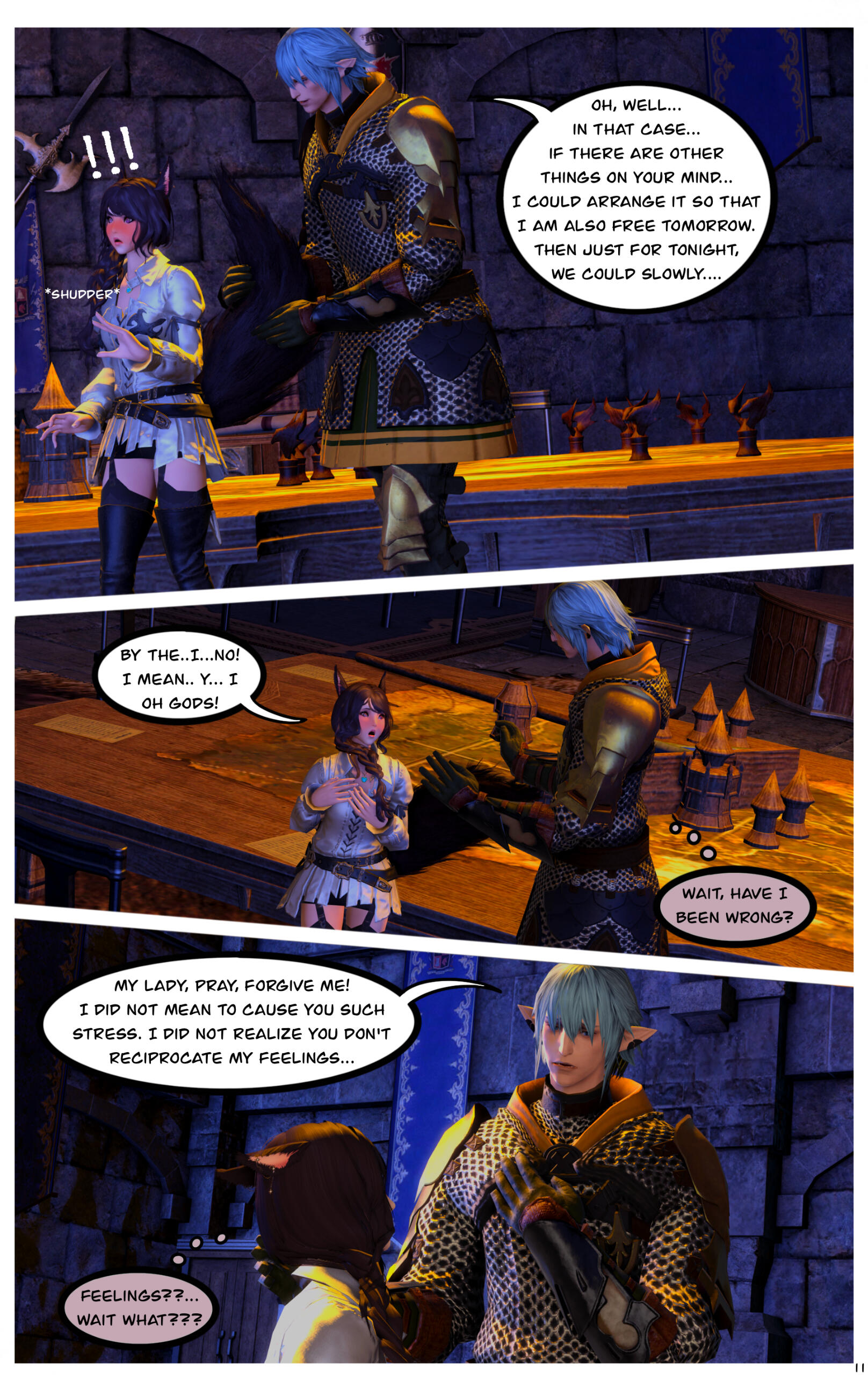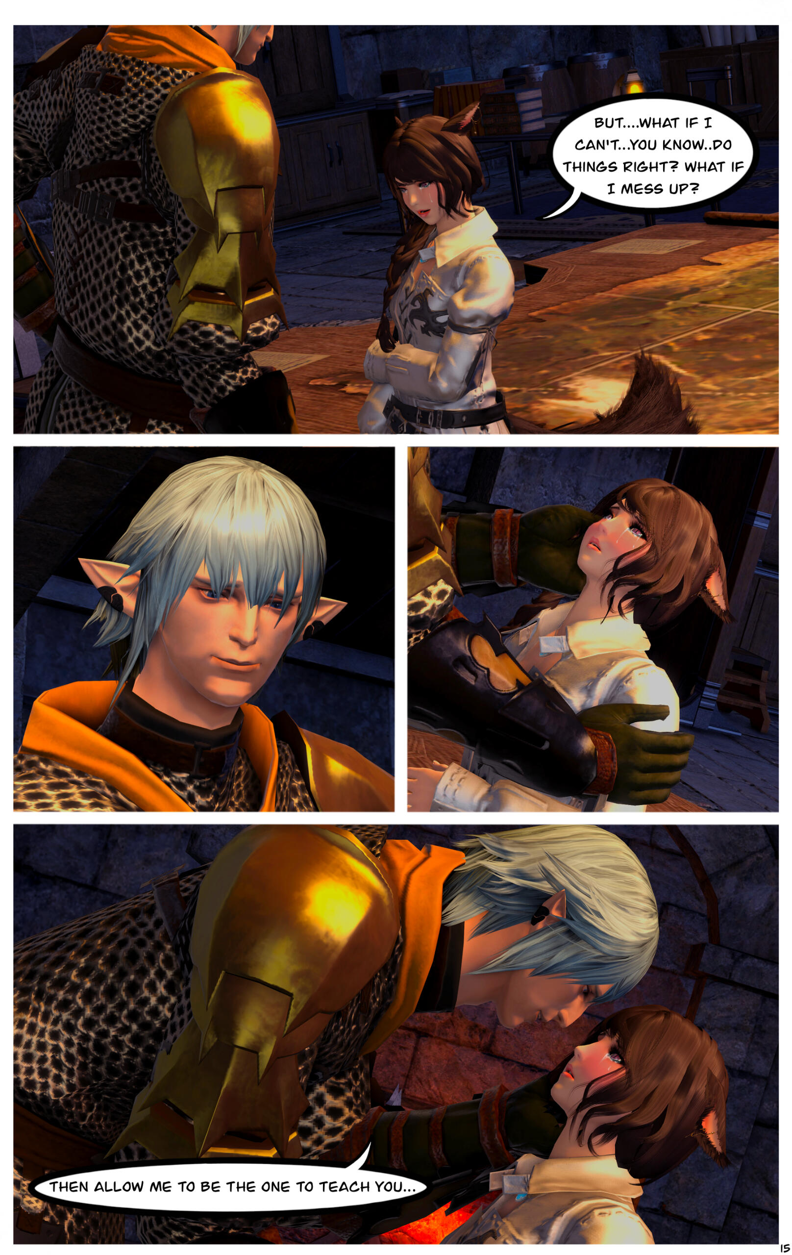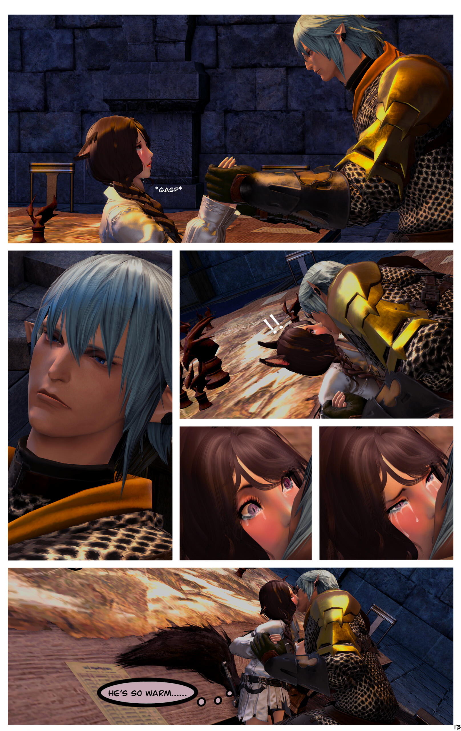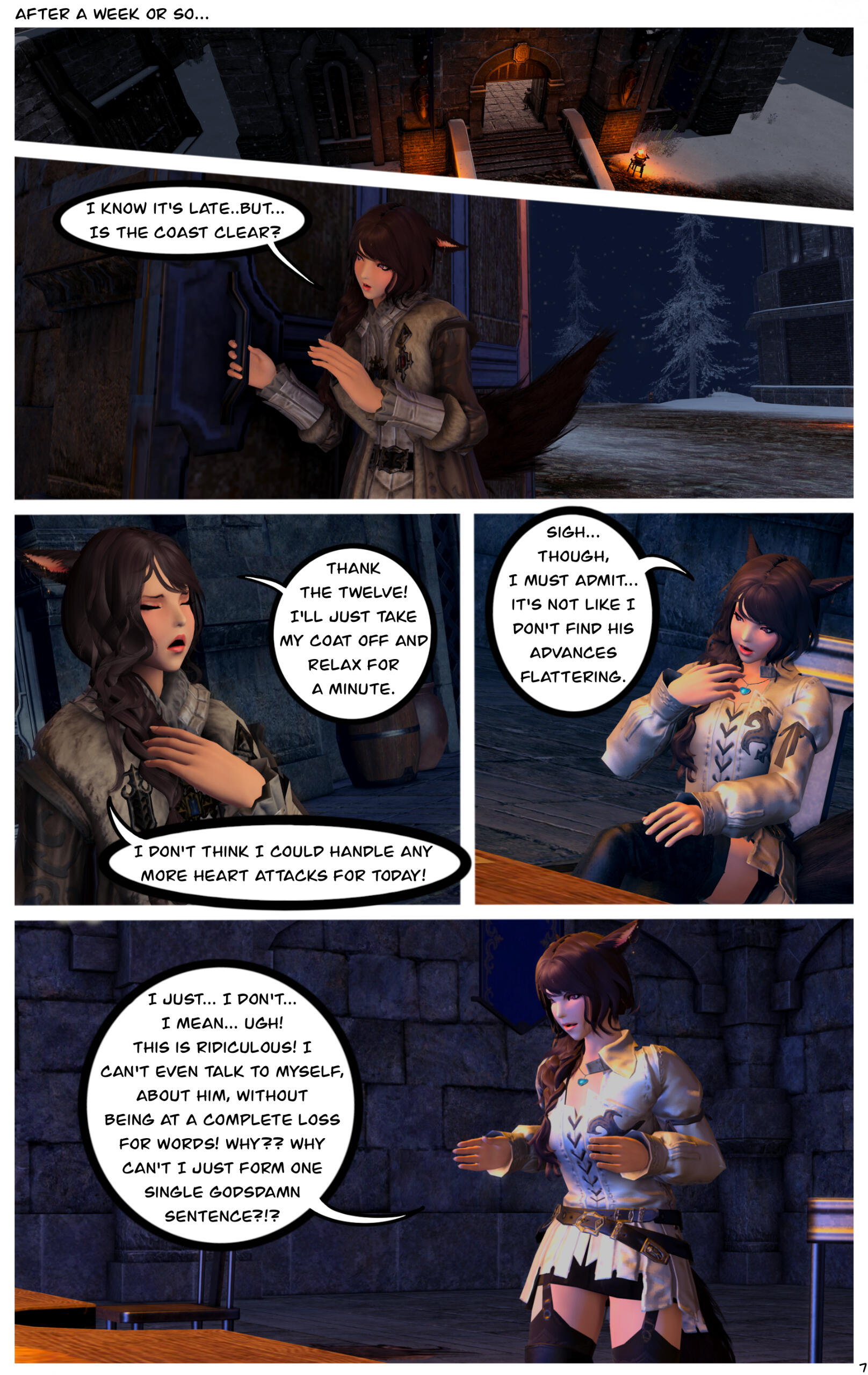 When they awoke, they could not recall how they got where they were or the events that had transpired prior. Zoha made her way back to Ul'dah and registered with the Adventurer's Guild in the city. R'azure decided to return to Limsa Lominsa, to register with their Adventurer's Guild. Writing to each other often, they began to do well for themselves, becoming well known with the locals in their Guilds.After a time, they both began to notice a change in themselves and their magicks. Not only were they much stronger than before, but they were also far more sensitive to those around them. On occasion they would feel a powerful force causing them to witness other events outside of their own lives, and sometimes could even feel or see what the other was feeling or doing. Not sure what this was, they shared it only between themselves.This effort of concealment was missed by most, save for the eyes of a neutral group known as the Scions of the Seventh Dawn. They had been seeking “exceptional” adventurers, like the siblings and others, to join their cause. With nothing tying them down, the two agreed.Her duties with the Scions kept her busy, but it did also provide quite the adventures and travels. The work was also fulfilling as Zoha helped each person or group she came across. R'azure, too, supported the work and message the Scions preached. Using his talents in healing and strategy, he worked closely with some of the other members in the group who were similar, while Zoha spent more time out in the field.Along the way they were also requested to join one of the City State's Grand Companies. While it did add more to her busy plate, it was a request Zoha couldn't afford to refuse. She opted to join The Immortal Flames of Ul'dah under General Raubahn Aldynn. The members were a hardy bunch and Zoha enjoyed their company as well. R'azure joined the Maelstrom of Limsa Lominsa, under Admiral Merlwyb Bloefhiswyn.While things with the Scions did get more political as time went on (God, she hated politics), Zoha was happy with the work and the people along side her. She was able to travel all over the realm, helping a great many of people, taking down powerful foes, and returning to tell her tales to the next eager minstrel. Even her brother was able to join her on several missions. The Scions began to grow, taking on more individuals, and beginning to work towards greater goals for all.During one particular job, she was sent to the snowy lands of Coerthas, to hunt down a missing airship. She had little experience with the people in this area and ran into a lot of resistance trying to request any kind of aid in her search. Upon reaching a location known as Camp Dragonhead, however, she found an Elezen known as Ser Haurchefant Greystone who welcomed her and offered assistance. Though only a couple years older, he was much taller than her and very handsome, with silver-blue hair and deep blue eyes. For the first time in her life Zoha found herself at a complete loss for words around him, as her father once did with her mother. While extremely kind-hearted, Haurchefant was also incredibly forward, and quite unapologetic about it, which only caused Zoha to fumble over her words even more. This mildly frustrated her, as she had zero experience with this sort of thing. In her 26 years, she had been so busy studying and working, she never once considered a relationship with anyone and thus was sorely inexperienced at how to respond to Haurchefant's advances.However, this back and forth didn't last too long, as one evening, while going over the plan for the following day, Haurchefant made his move. At the risk of sounding uninterested, Zoha was forced to admit her shortcomings to him, which unsurprisingly did not dissuade him in the slightest. He knew he loved her, and he was willing to go to any lengths to make her happy.Over the course of her time in Coerthas, she spent her days gaining the local's trust to assist in the lost airship search and trained in the various ways of Ishgardian combat with the Camp Dragonhead knights. Her every night was spent with Haurchefant, as he trained her in the various ways of love. At the time, it would have been difficult to be open about their relationship, especially since Camp Dragonhead was providing assistance to the airship search and vouching for the Scions, so they decided to keep quiet about it until a better time allowed. Not only that, inter-racial relationships were still frowned upon in many areas of Eorzea, especially ones as traditional as Ishgard's nations. Twelve be damned, though, Zoha couldn't care much less about anything but him.After several weeks, the airship had been found and she was called back to the Scions. Though disheartened to leave, she agreed to visit whenever able and both agreed to write when she could not visit. Before setting off, Haurchefant gifted her an Ishgardian Knight's ring so that she could always have a part of him with her. It was a beautiful dark metal with the crest of his family, House Fortemps, on it. She never took it off. With a kiss and a wave, she was on her way back.Jobs with the Scions began to increase in frequency, though, quite frankly, Zoha didn't really think too hard on them as she completed each task. Her thoughts were elsewhere, in the snowy north. She had excitedly told her brother about her time there, though she did leave out some particular details. R'azure was happy for her, but also a bit concerned for who the hell this Elezen was, sweeping his sister off her feet like that. They didn't have too much time to speak more on the matter, as the Scions decided to move their main base of operations to a more neutral zone. The new HQ was going to be on the south end of Coerthas, in Mor Dhona, which meant she had the ability to see Haurchefant even more. So while others struggled with the decision to move, she happily pitched in with the efforts.Over the next week or so, Zoha continued her duties and seeing t