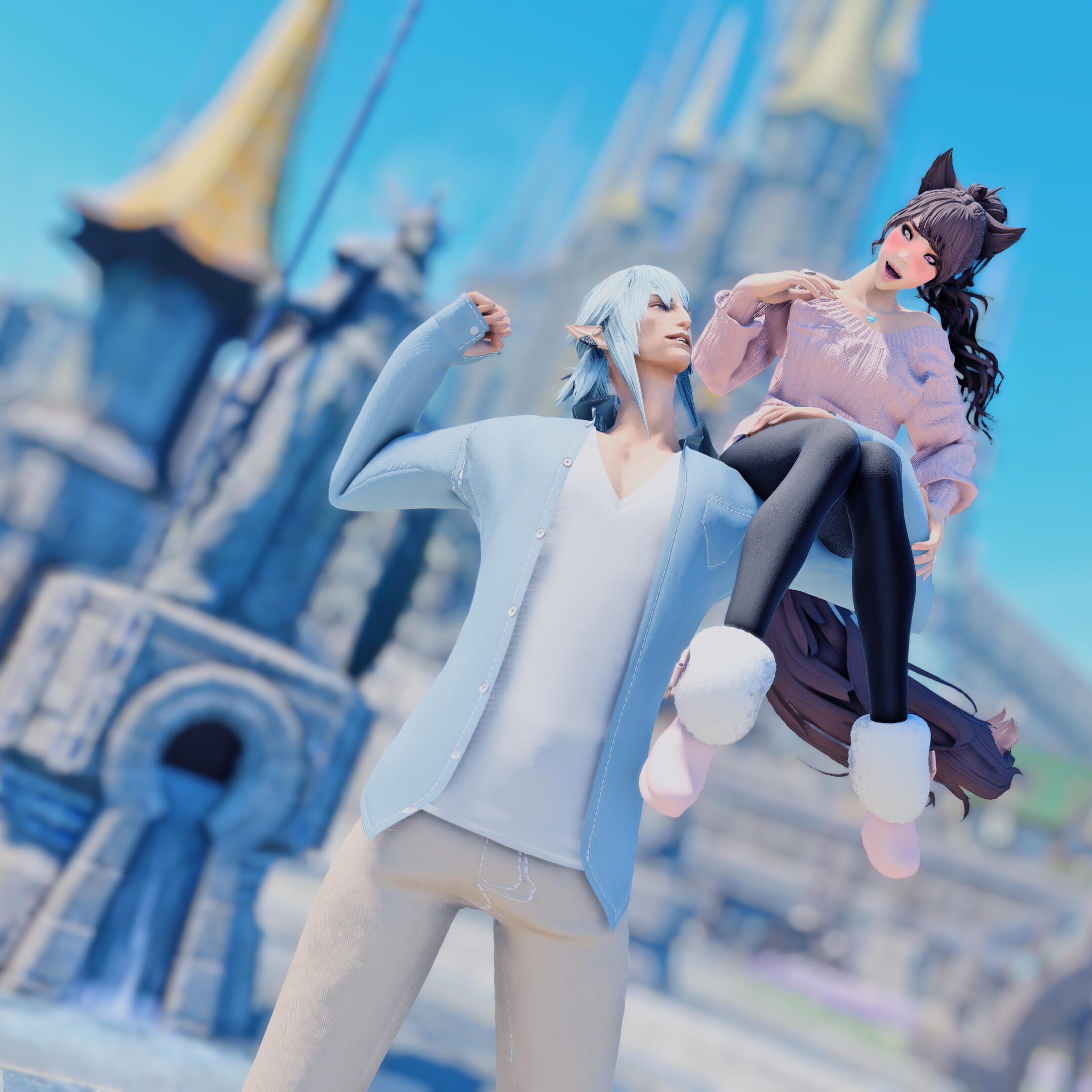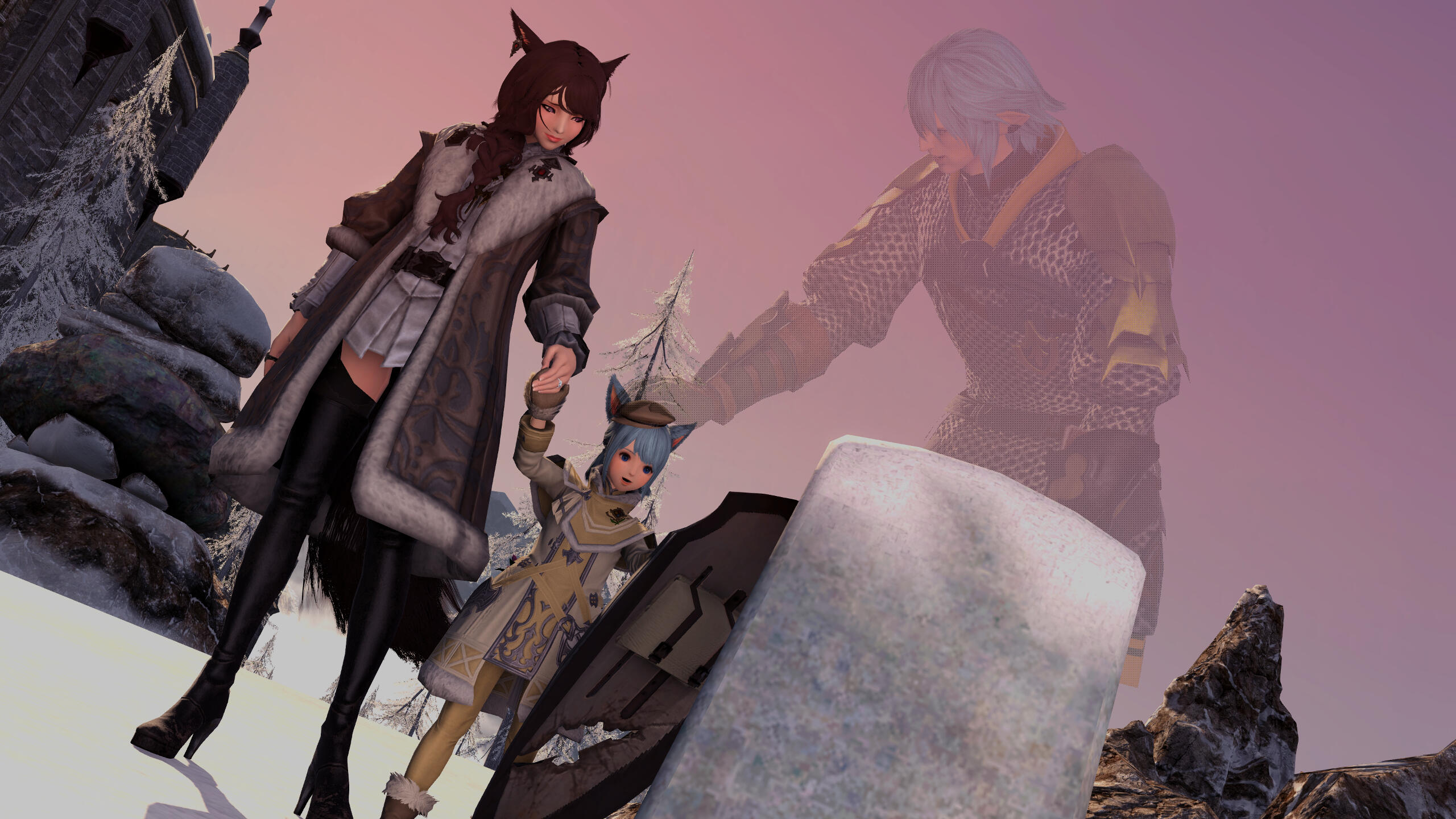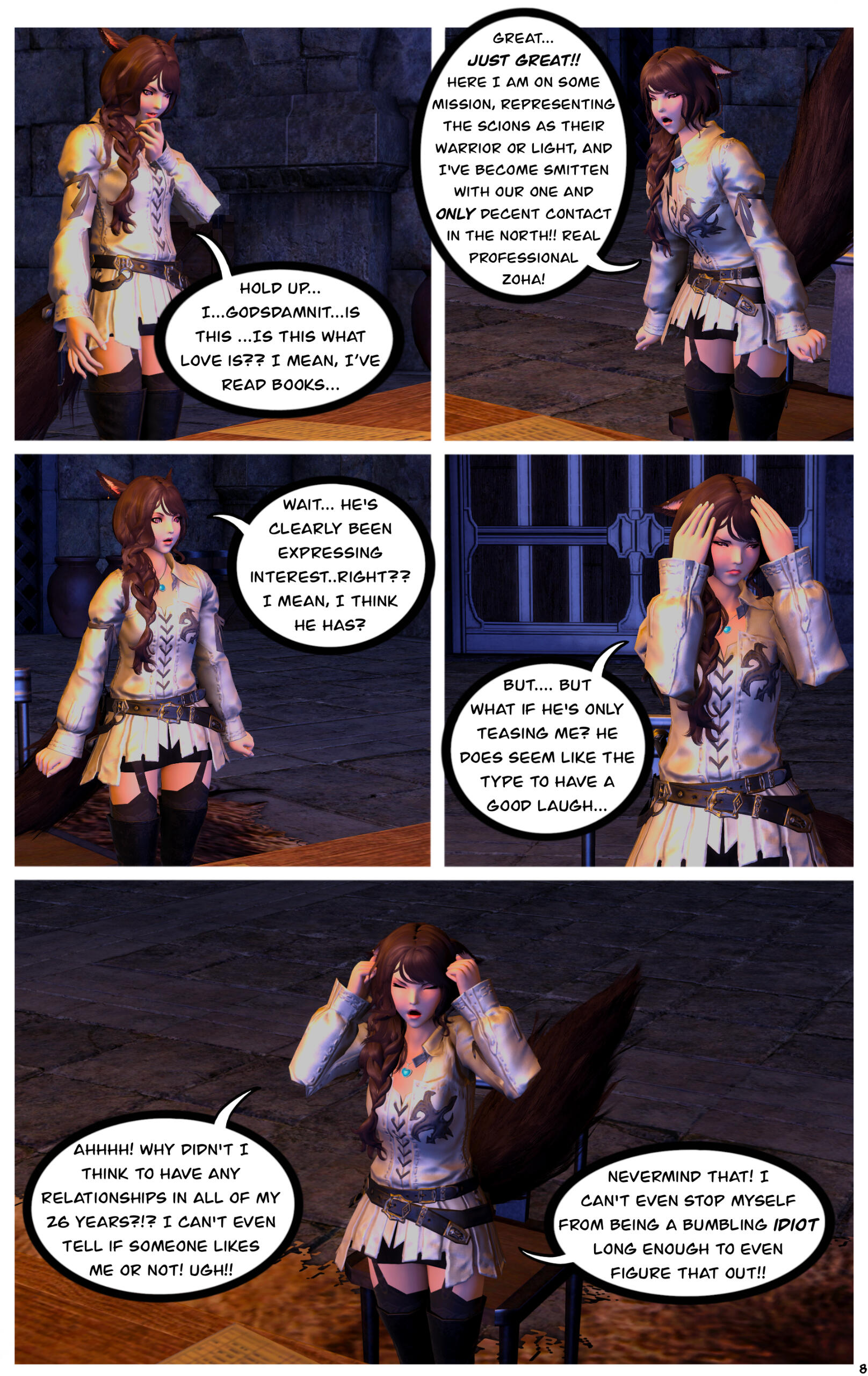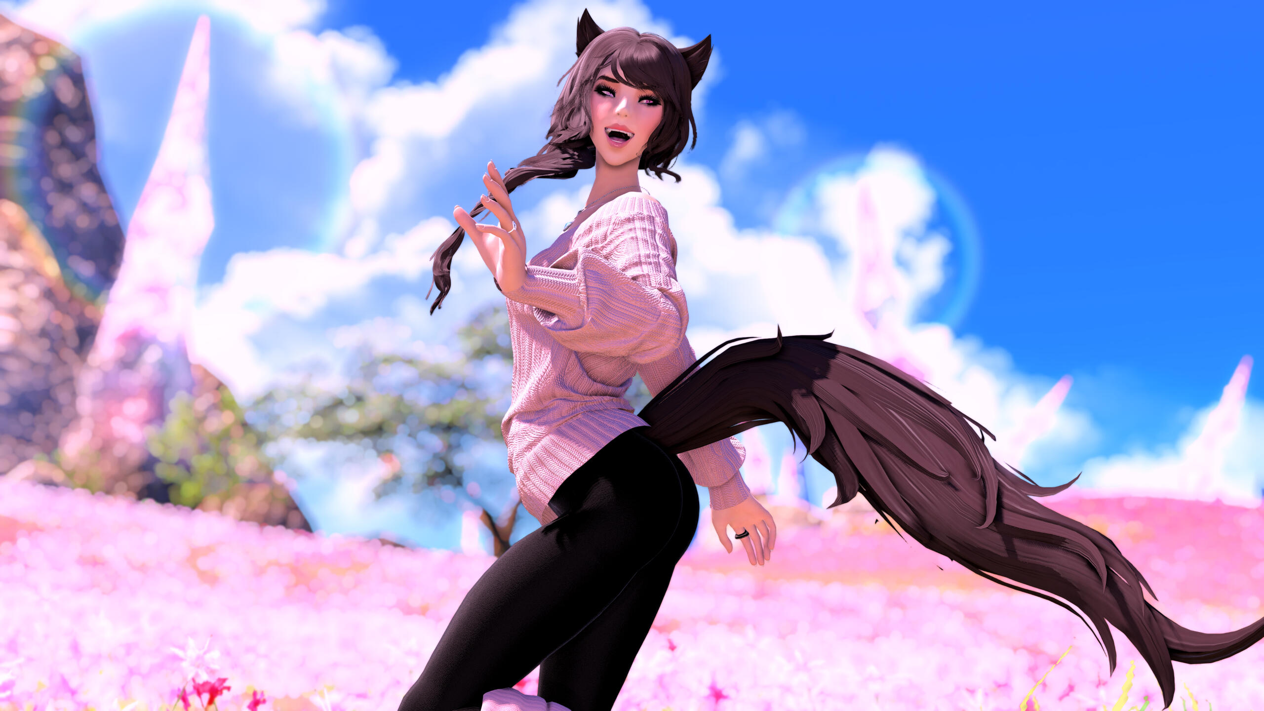 R’zoha is very positive, friendly and upbeat with everyone she knows or meets. She’s fairly introverted, though, so doesn’t handle lots of people as comfortably as other folks might. And while being very friendly, she’s still very quiet/shy around new people. Despite that, however, she’s very open and boisterous around those she knows well and considers a friend, so often times she is mistaken for being more extroverted than she actually is. Regardless, she does always try to help others find happiness as that brings her the most joy in her own life. Rarely focusing on her own accomplishments, she delights in hearing about the achievements of others around her.It doesn’t show often, but she is also incredibly sassy around anyone she’s most comfortable with, her younger brother, or when taunting her enemies. It’s only occasionally slipped out during meetings where she’s trying to bite her tongue. She did grow up in Limsa Lominsa, so she swears a lot and is also extremely competitive, both mostly due to being surrounded by the pirate culture. While she tries to hide or bottle her emotions, her ears and tail are a dead giveaway for how she’s feeling as they will always move according to her current mood. She will also head bump the people she loves most, as a sign of affection. When it comes to things she’s passionate about, she can sometimes be moody and emotional. She blushes easily and, while it’s pretty cute, this can sometimes frustrate her if it’s pointed out.Her default mode, when she’s with friends, is very excitable, chatty, a little clumsy, and extremely distractible. She is fairly intelligent but if something else is interesting then it has all of her attention, so she can sometimes miss details of a conversation or situation because of that. This especially happens when she’s around moogles or moogle related things. They’re her most favorite for their squishy, plump adorableness and she keeps a secret apartment in Ul’dah, to house all of her moogle related memorabilia (it’s not an addiction unless it becomes a problem, right??). The only people in Eorzea who currently know about this are her younger brother, who loves to tease her over it, and her husband Haurchefant, who’s very supportive and even encourages it, because he thinks it’s really cute when she gets excited about her interests.Her favorite food is strawberry cake and her favorite color is pastel pink (most of her wardrobe is this color). While she prefers to remain comfortable and mobile in her gear, there is a part of her that enjoys dressing up and looking really pretty for events, even if she ends up being a wallflower for most of them. Her favorite pastimes are drawing, baking, and singing (to herself, not around others) and she’s very skilled in all three. Even though she is introverted, she can definitely appreciate going out with friends from time to time, as much as cuddling up with some cocoa and a good book. She loves music and is always excited to get new recommendations from others and, despite not being well versed in it, she also loves dancing a lot as well.While considered attractive by many others, her physical appearance is much shorter than most Miqo’te her age and her chest isn’t as “well-endowed” as some of her peers. Despite her thinking these are issues, they’re never noticed by anyone else because it’s her pretty smile, bright eyes, joyful laughter, and fun personality that wins most folks over. She’s 26yrs old, 5’2”, and has dark brown, long wavy hair, that’s kept in a loose braid, and a matching long silky tail. Her left eye is a dark pink, while her right eye is a very pale pink. Both eyes used be dark pink, but the events at the Battle of Carteneau left her right eye the way it is now. While it was initially thought that this was due to aether overexposure from the mysterious flash of light on the battlefield, it isn’t until she learns of her ancient/Azem-self, Euphrosyne, that she finds out they had pale pink eyes. The unknown flash of light at Carteneau, coupled with receiving the Blessing of Light at the same time, was merely the trigger for this effect. All of her other shards also have a pale pink, right eye.She is not without fault though. She has trouble relinquishing control in situations or missions, or delegating tasks to others. Her Type-A personality shows a lot here, because she’ll often default to “well I can just do it myself”. She has trouble asking for help, and should she lose control of whatever situation she’s in it causes her a lot of stress, and she’ll get frazzled easily. She’s very much a perfectionist and will frequently criticize herself for not doing or saying things as “perfectly” as her mind made her think it should have been. She’s very prideful of her work and always wants to make sure she does a good job. This occasionally does come with an ego, as she might get a bit smug whenever she accomplishes a particularly difficult task.Unfortunately, she does also carry a heavy weight in the form of survivor’s guilt. Her parents were murdered when she was very young and, while they forced her to hide with her younger brother, she sadly saw the whole event unfold. This is compounded when she becomes the WOL, as there are more occasions where she loses others despite her best efforts. She’s only able to begin working through this after seeing her parents again in the Altiascope. Because of their past though, she is extremely protective of her little brother, as he is with her too. They ended up both receiving Hydaelyn’s Blessing and therefore share most of the WOL’s duties, so they see each other often in their work and are very close and supportive of each other.Despite her struggles, she still manages to remain resilient in difficult situations, or in the face of failure. Her optimism and confidence are often anchors for others around her, who may lose their willpower over the c