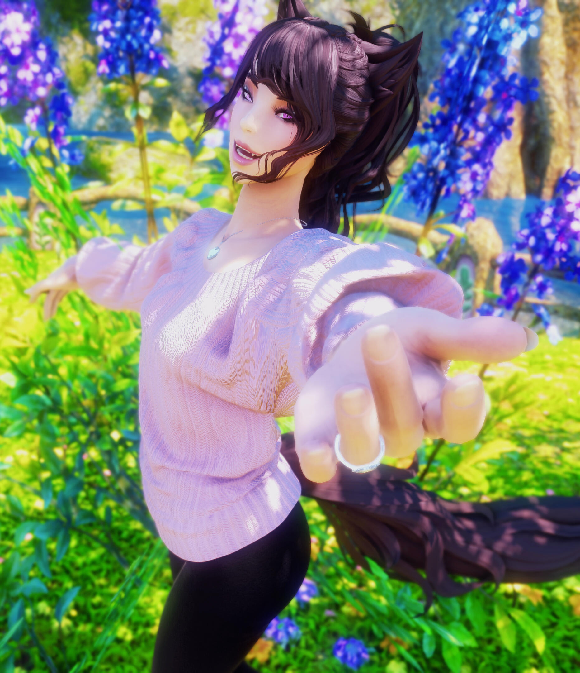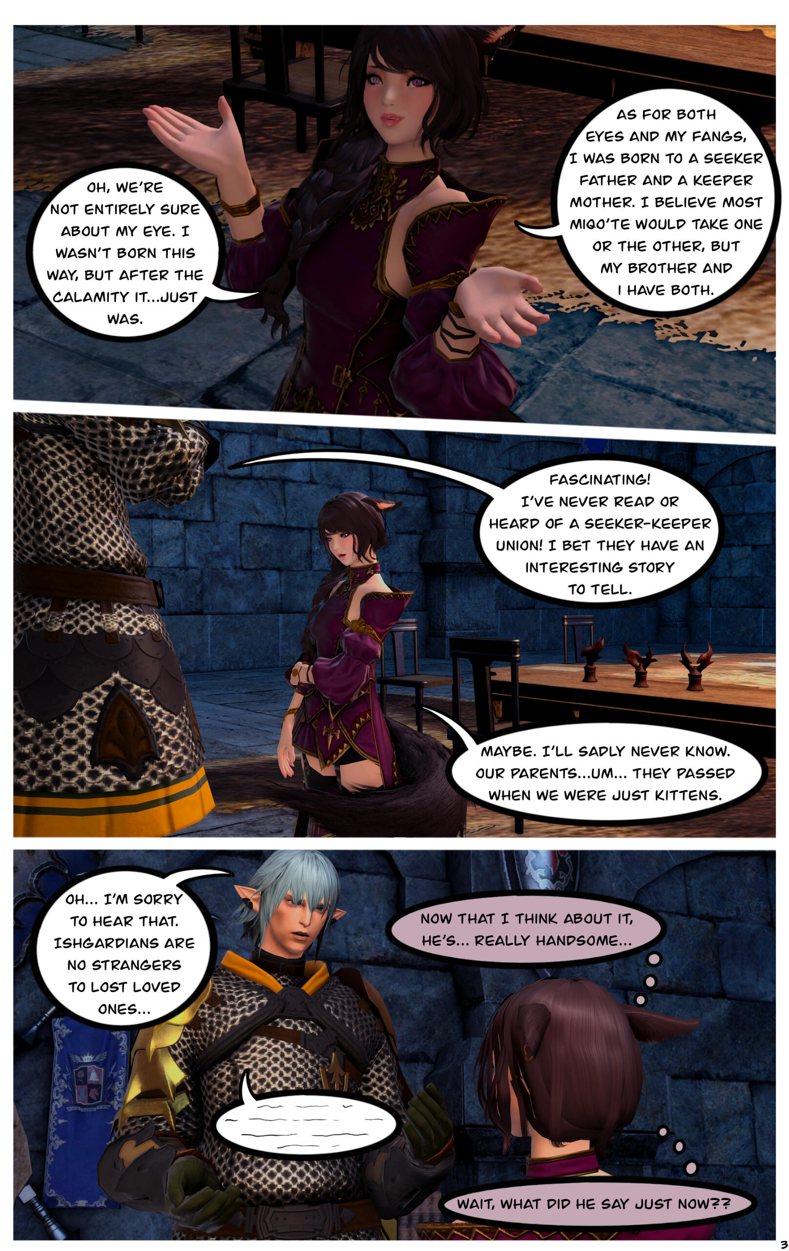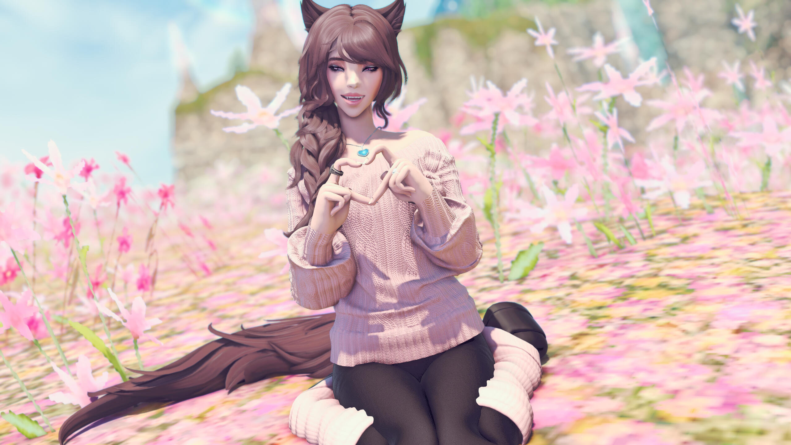 R’zoha is very positive, friendly and upbeat with everyone she knows or meets. She’s fairly introverted, though, so doesn’t handle lots of people as comfortably as other folks might. And while being very friendly, she’s still very quiet/shy around new people. Despite that, however, she’s very open and boisterous around those she knows well and considers a friend, so often times she is mistaken for being more extroverted than she actually is. Regardless, she does always try to help others find happiness as that brings her the most joy in her own life. Rarely focusing on her own accomplishments, she delights in hearing about the achievements of others around her.It doesn’t show often, but she is also incredibly sassy around anyone she’s most comfortable with, her younger brother, or when taunting her enemies. It’s only occasionally slipped out during meetings where she’s trying to bite her tongue. She did grow up in Limsa Lominsa, so she swears a lot and is also extremely competitive, both mostly due to being surrounded by the pirate culture. While she tries to hide or bottle her emotions, her ears and tail are a dead giveaway for how she’s feeling as they will always move according to her current mood. She will also head bump the people she loves most, as a sign of affection. When it comes to things she’s passionate about, she can sometimes be moody and emotional. She blushes easily and, while it’s pretty cute, this can sometimes frustrate her if it’s pointed out.Her default mode, when she’s with friends, is very excitable, chatty, a little clumsy, and extremely distractible. She is fairly intelligent but if something else is interesting then it has all of her attention, so she can sometimes miss details of a conversation or situation because of that. This especially happens when she’s around moogles or moogle related things. They’re her most favorite for their squishy, plump adorableness and she keeps a secret apartment in Ul’dah, to house all of her moogle related memorabilia (it’s not an addiction unless it becomes a problem, right??). The only people in Eorzea who currently know about this are her younger brother, who loves to tease her over it, and her husband Haurchefant, who’s very supportive and even encourages it, because he thinks it’s really cute when she gets excited about her interests.Her favorite food is strawberry cake and her favorite color is pastel pink (most of her wardrobe is this color). While she prefers to remain comfortable and mobile in her gear, there is a part of her that enjoys dressing up and looking really pretty for events, even if she ends up being a wallflower for most of them. Her favorite pastimes are drawing, baking, and singing (to herself, not around others) and she’s very skilled in all three. Even though she is introverted, she can definitely appreciate going out with friends from time to time, as much as cuddling up with some cocoa and a good book. She loves music and is always excited to get new recommendations from others and, despite not being well versed in it, she also loves dancing a lot as well.While considered attractive by many others, her physical appearance is much shorter than most Miqo’te her age and her chest isn’t as “well-endowed” as some of her peers. Despite her thinking these are issues, they’re never noticed by anyone else because it’s her pretty smile, bright eyes, joyful laughter, and fun personality that wins most folks over. She’s 26yrs old, 5’2”, and has dark brown, long wavy hair, that’s kept in a loose braid, and a matching long silky tail. Her left eye is a dark pink, while her right eye is a very pale pink. Both eyes used be dark pink, but the events at the Battle of Carteneau left her right eye the way it is now. While it was initially thought that this was due to aether overexposure from the mysterious flash of light on the battlefield, it isn’t until she learns of her ancient/Azem-self, Euphrosyne, that she finds out they had pale pink eyes. The unknown flash of light at Carteneau, coupled with receiving the Blessing of Light at the same time, was merely the trigger for this effect. All of her other shards also have a pale pink, right eye.She is not without fault though. She has trouble relinquishing control in situations or missions, or delegating tasks to others. Her Type-A personality shows a lot here, because she’ll often default to “well I can just do it myself”. She has trouble asking for help, and should she lose control of whatever situation she’s in it causes her a lot of stress, and she’ll get frazzled easily. She’s very much a perfectionist and will frequently criticize herself for not doing or saying things as “perfectly” as her mind made her think it should have been. She’s very prideful of her work and always wants to make sure she does a good job. This occasionally does come with an ego, as she might get a bit smug whenever she accomplishes a particularly difficult task.Unfortunately, she does also carry a heavy weight in the form of survivor’s guilt. Her parents were murdered when she was very young and, while they forced her to hide with her younger brother, she sadly saw the whole event unfold. This is compounded when she becomes the WOL, as there are more occasions where she loses others despite her best efforts. She’s only able to begin working through this after seeing her parents again in the Altiascope. Because of their past though, she is extremely protective of her little brother, as he is with her too. They ended up both receiving Hydaelyn’s Blessing and therefore share most of the WOL’s duties, so they see each other often in their work and are very close and supportive of each other.Despite her struggles, she still manages to remain resilient in difficult situations, or in the face of failure. Her optimism and confidence are often anchors for others around her, who may lose their willpower over the c