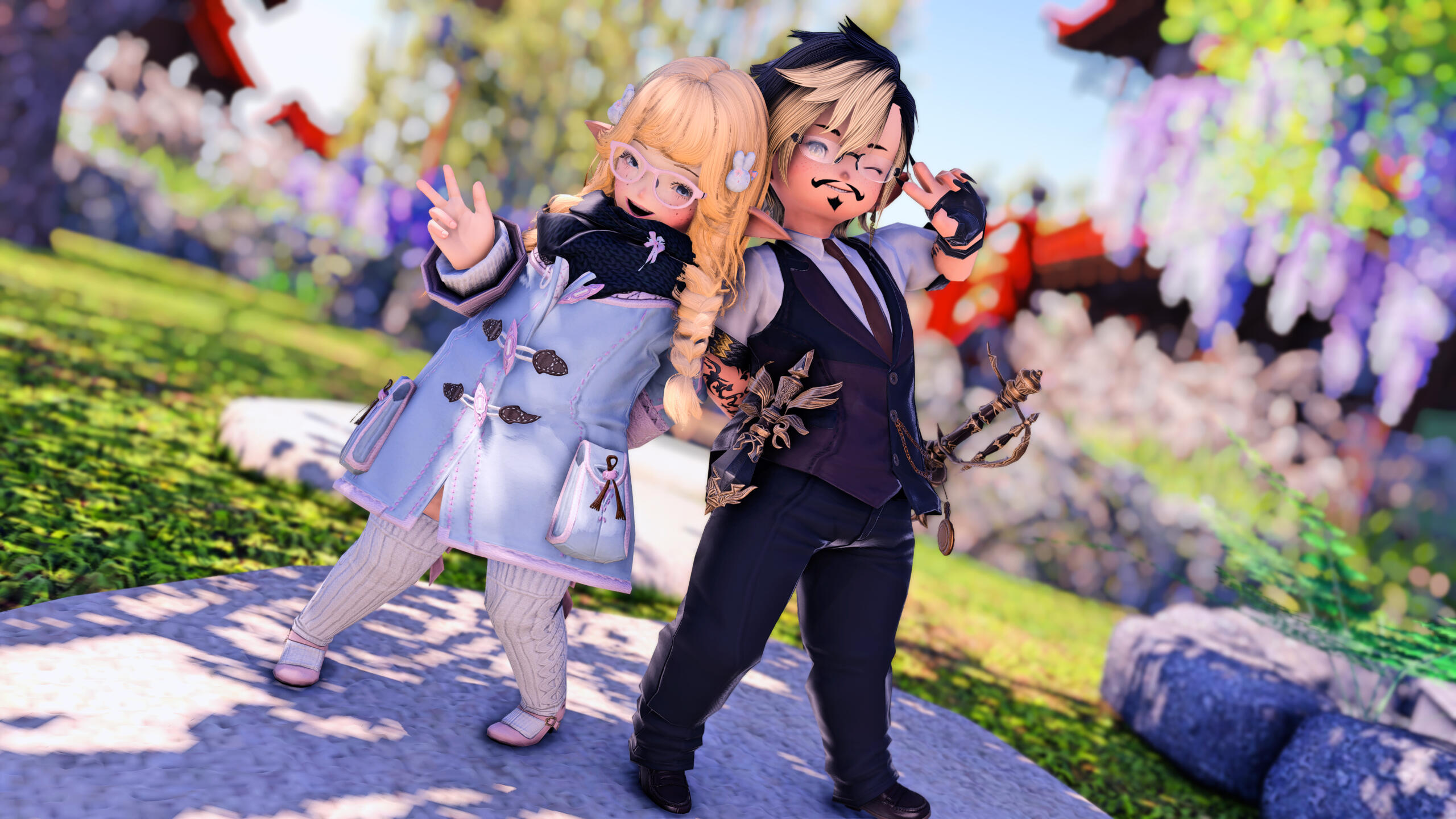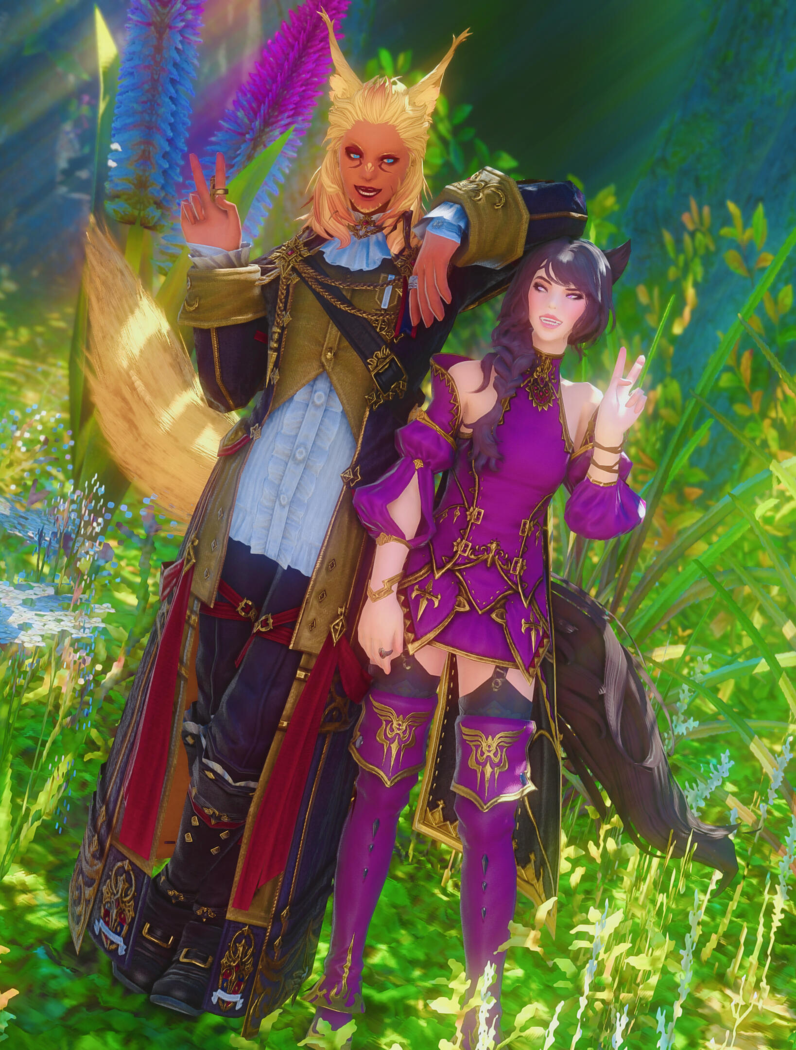 Years went by and the two became highly skilled in their respective magics. R'zoha was an excellent Summoner by age 20, picking up several other jobs along the way that she trained in her spare time. She'd grown into a fine young woman, with fair skin and long curly hair, that she kept in a loose braid most of the time, a silky tail like her mother's, and fluffy ears. She was still one of the shortest Miqo'te around, but she made up for that with as much beauty as her mother had, and the fiery attitude of her father. Her resilience certainly made her a powerful ally to any team. By now, she had chosen to go by the nickname Zoha or Zoh, since many of the other races could pronounce it easier.R'azure went the way of the Scholars and could heal any wound that came his way. While he had taken on a few additional jobs, he ended up really preferring to learn the various crafts of the world instead. In his spare time he would spend many hours with the blacksmiths, goldsmiths, miners, alchemists, weavers, and any other craft guild he could gain access to. He too had grown into a handsome young man. His blonde hair was also long and he usually let it fall down to his shoulders. He was muscular in build with darker skin and large fluffy ears, like his father, and he spent more time calculating his actions before executing, like his mother. While initially shorter, he had grown to be much taller than Zoha. And although a chosen few could call him Azure, Zoha included, he mostly continued to go by R'azure to most. Though born a Tia, he opted to change his surname to Nunh as a way to feel closer to his father, even though there was no tribe for him to oversee.With naught else to teach them, the Arcanists let them out into the world. Promising to keep in touch with each other, the two said their goodbyes and were on their way as new adventurers.